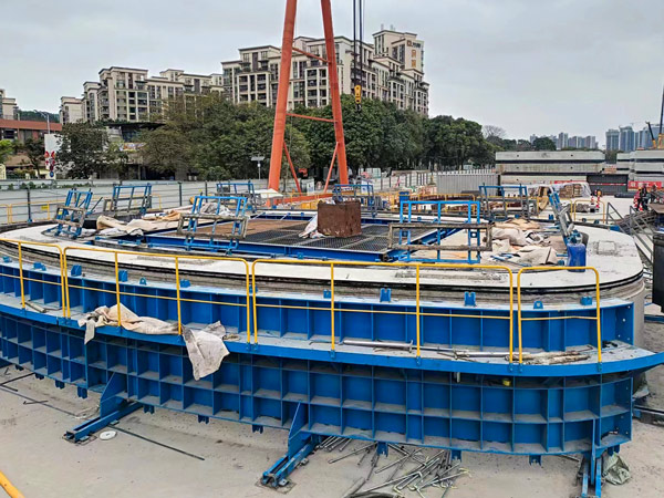 傳統(tǒng)的混凝土管節(jié)預(yù)制采用內(nèi)、外部簡(jiǎn)易支架和組合小鋼模或木模,人工澆筑混凝土的方法,此工藝需要投入的人工較多,由于預(yù)制管節(jié)直徑較小,工作面小,工效較低,所以每節(jié)預(yù)制管模板及支架施工的時(shí)間較長(zhǎng),機(jī)械化施工程度也不高,且模板接縫處混凝土不飽滿(mǎn)及混凝土外觀質(zhì)量較差。超大斷面管節(jié)因截面尺寸較大,外輪廓尺寸大,每節(jié)段重量超過(guò)百?lài),從而管?jié)的預(yù)制模具需要結(jié)構(gòu)強(qiáng)、尺寸大,重量重,傳統(tǒng)圓形模具拆裝困難,甚至無(wú)法拆裝。傳統(tǒng)工藝需要投入的人工較多,由于預(yù)制管節(jié)直徑較小,工作面小,工效較低,所以每節(jié)預(yù)制管模板及支架施工的時(shí)間較長(zhǎng),機(jī)械化施工程度也不高,且模板接縫處混凝土不飽滿(mǎn)及混凝土外觀質(zhì)量較差。傳統(tǒng)的翻轉(zhuǎn)吊具翻轉(zhuǎn)管材時(shí),翻轉(zhuǎn)速度太快,由于管材自身重量太大,慣性產(chǎn)生額外沖量,降低吊具安全性能,容易發(fā)生事故,使管子產(chǎn)生局部裂縫和缺角掉邊的現(xiàn)象。超大口徑管子混凝土方量大,加料次數(shù)多,傳統(tǒng)的將軍帽布料不均勻,不但增加了振搗的工作量而且也會(huì)給混凝土帶來(lái)密實(shí)度不均勻的問(wèn)題。